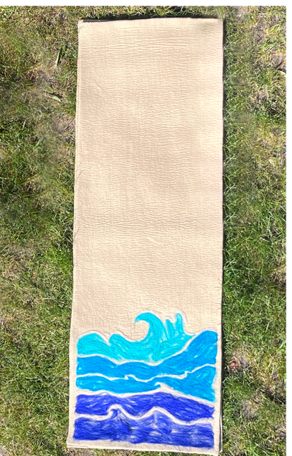 De tekening van de golven, met subtiele variaties in de blauwe tinten van de merinowol, weerspiegelt de dynamiek en de rustgevende energie van de zee. Het is als een visuele meditatie die je uitnodigt om de diepere lagen van jezelf te verkennen en je te verbinden met de innerlijke stromingen van je wezen.